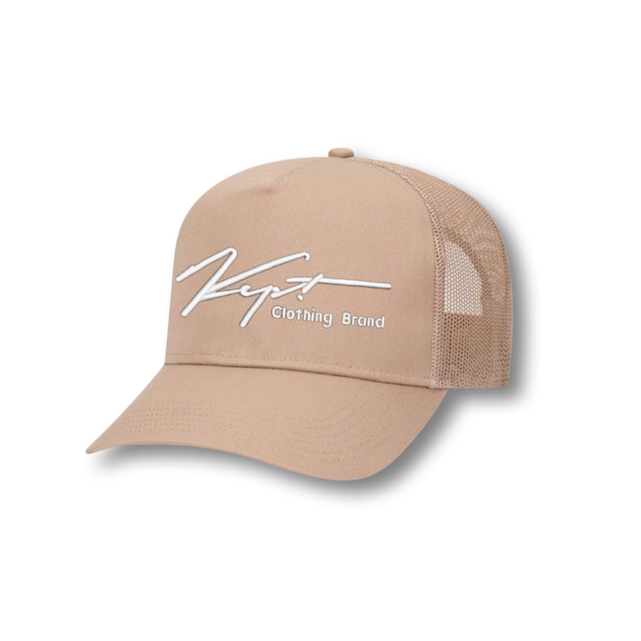 The Signature Snapback Trucker Hat by KEPT Clothing Brand features an iconic logo embroidery, a black/white design on the front, a black breathable mesh rear, and an adjustable snapback panel.
