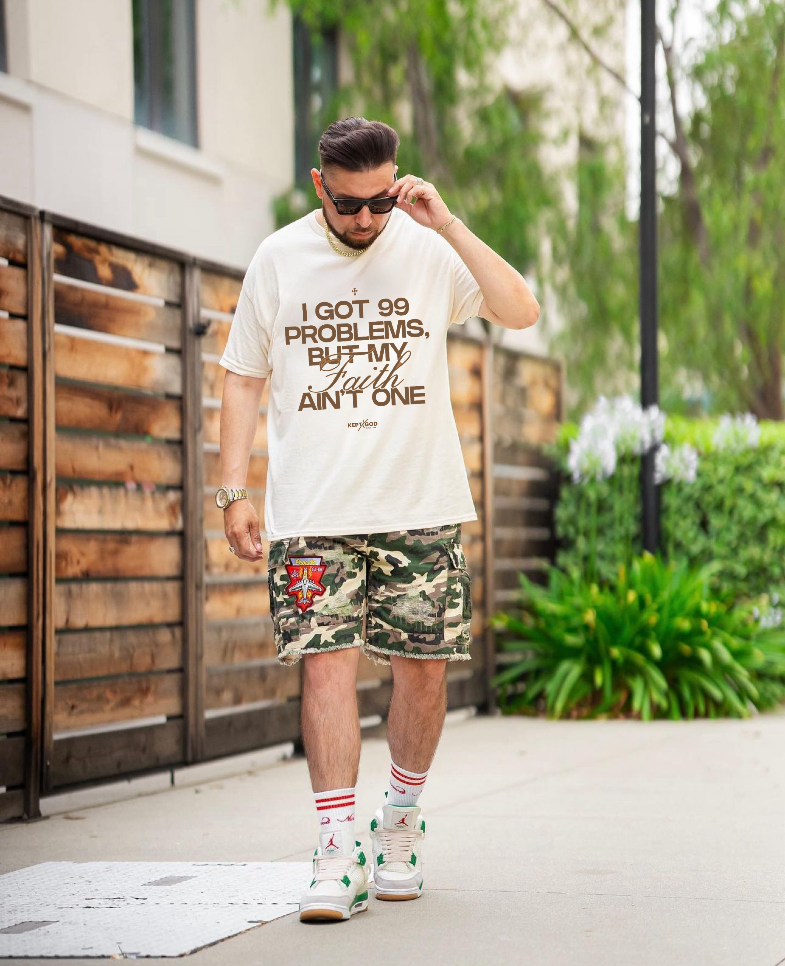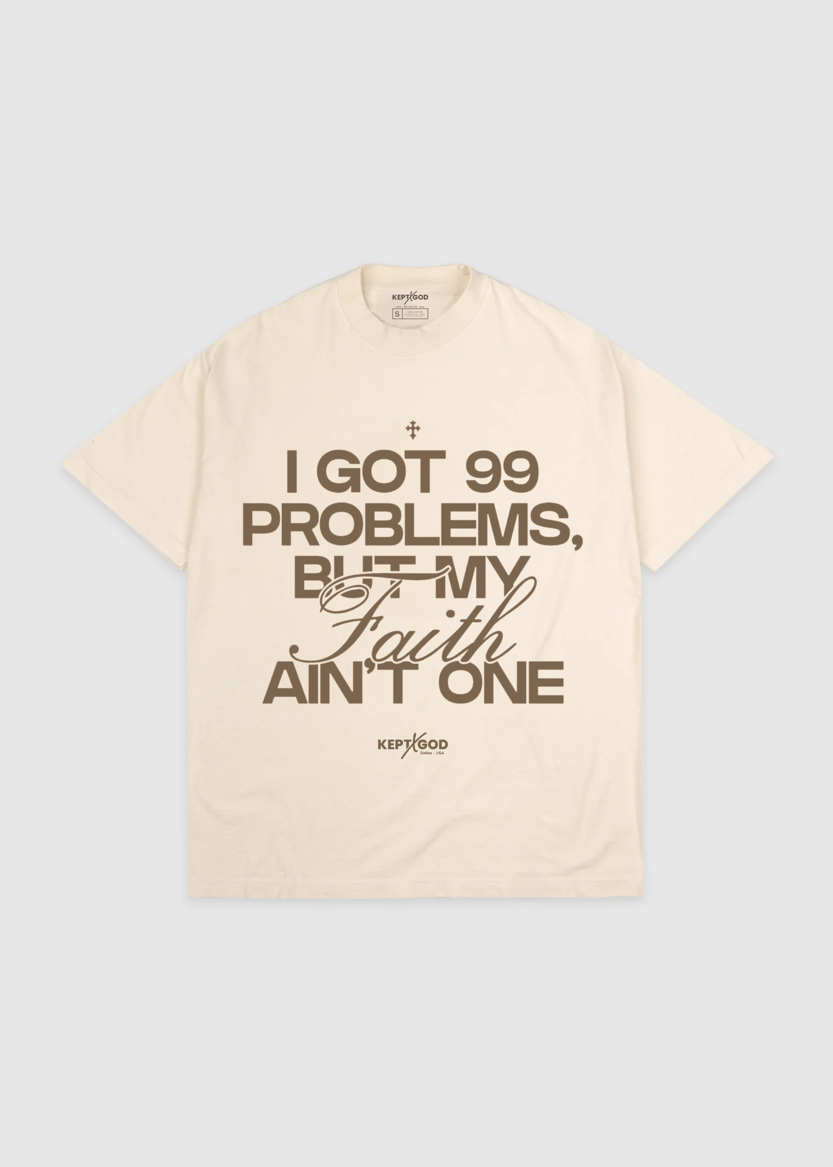 Showcase your unshakable faith and resilience with the "99 Problems But My Faith Ain't One" T-Shirt from Kept x God. This bold and stylish shirt features a captivating design that combines streetwear aesthetics with a powerful spiritual message. Let it serve as a reminder that no matter the challenges you face, your faith will guide you through them all.