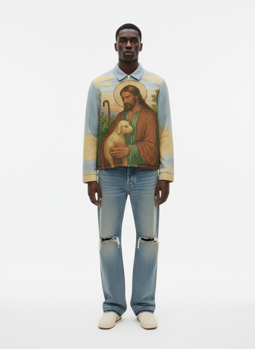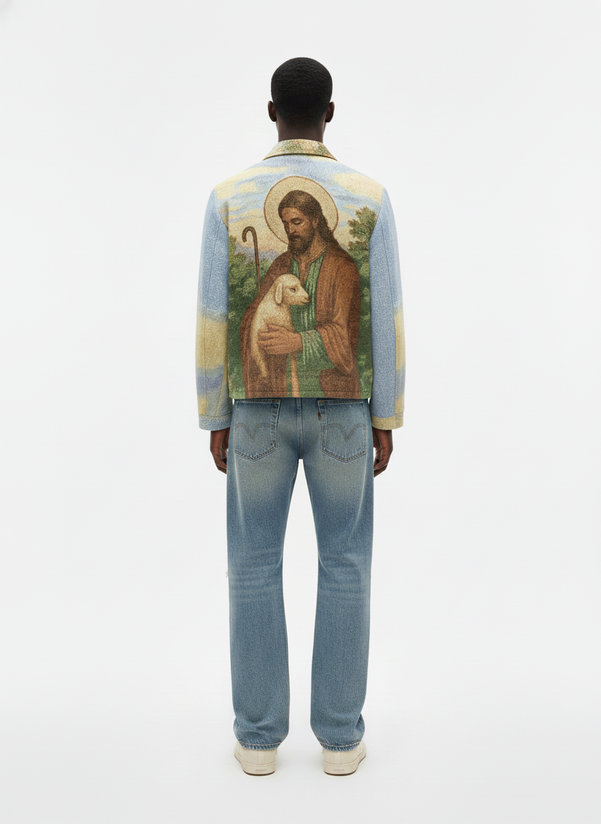 The Good Shepherd Tapestry Jacket is a statement piece—woven, not printed, to tell a story of protection and purpose. Crafted with heavyweight jacquard fabric, every detail reflects divine craftsmanship: a visual parable of the Shepherd who guards His flock.