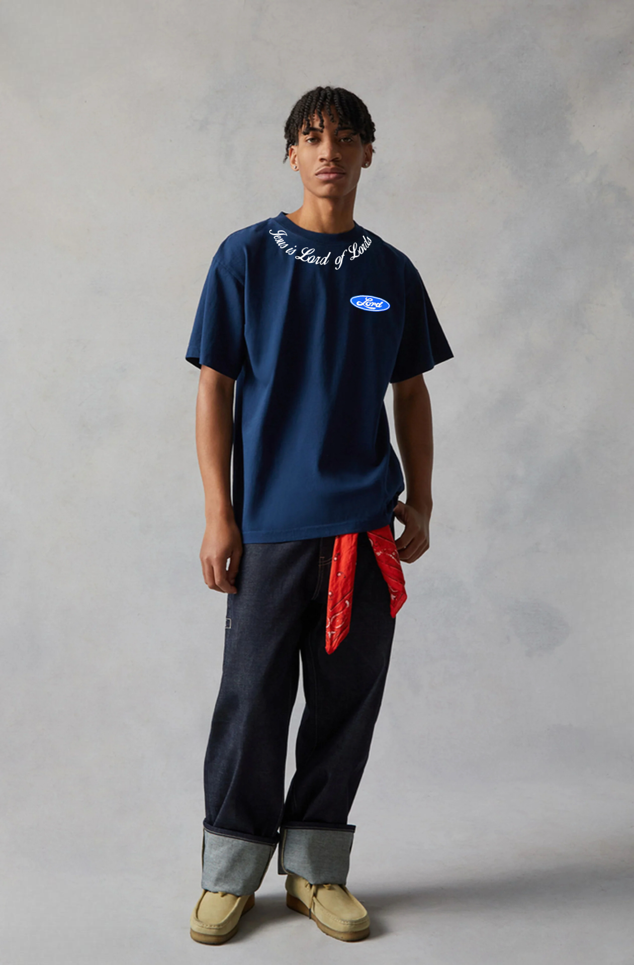Crafted from heavyweight 100% cotton, this oversized navy tee carries a bold witness. Featuring a curved neckline print that reads “Jesus is Lord of Lords” and a blue “Lord” emblem on the front chest, this piece is more than style—it’s a statement. Designed for comfort and made to spark faith.